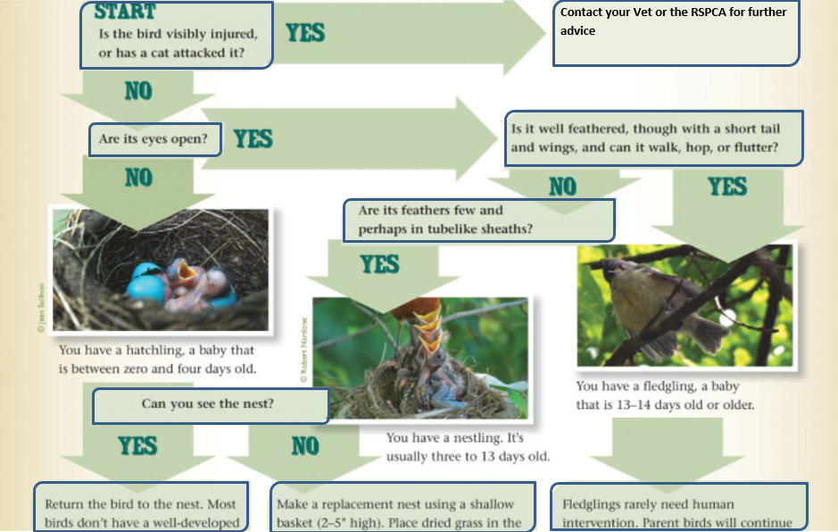 If you discover that the bird is injured/ or appears unwell, please place it in a secure box or container and contact the nearest vet. The vet staff will help you with further instructions and likely ask you to bring the bird to them for first-aid. All vets will provide first-aid to wildlife at no cost to the public. We often see many baby birds coming in and out of here at McDowall Vets.