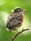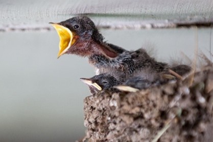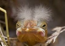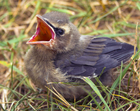 A nestling is a baby bird generally between 3 and 14 days old. Most of their bare skin will be covered by fluff or pin-feathers (pin-like long structures which are the beginning of new feathers). Their eyes will be open, and in a healthy nestling – most likely their mouths as the cry for food! They still rely on their parents to keep them warm.